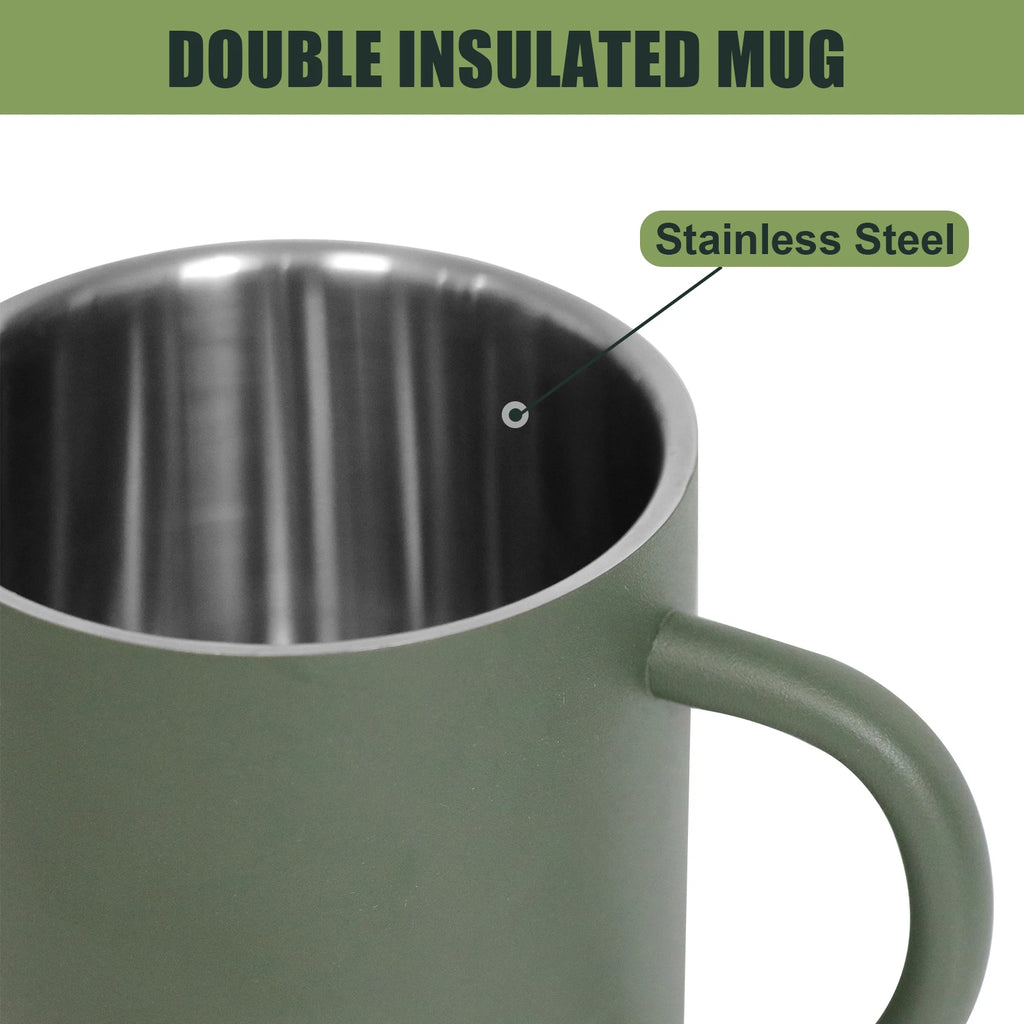 Crafted from food-grade stainless steel with a matte army green finish, this mug is both rugged and stylish. Available in 300ml and 450ml capacities, it features a practical handle for easy grip. Its durable, unbreakable construction makes it ideal for camping, picnics, travel, and everyday use.